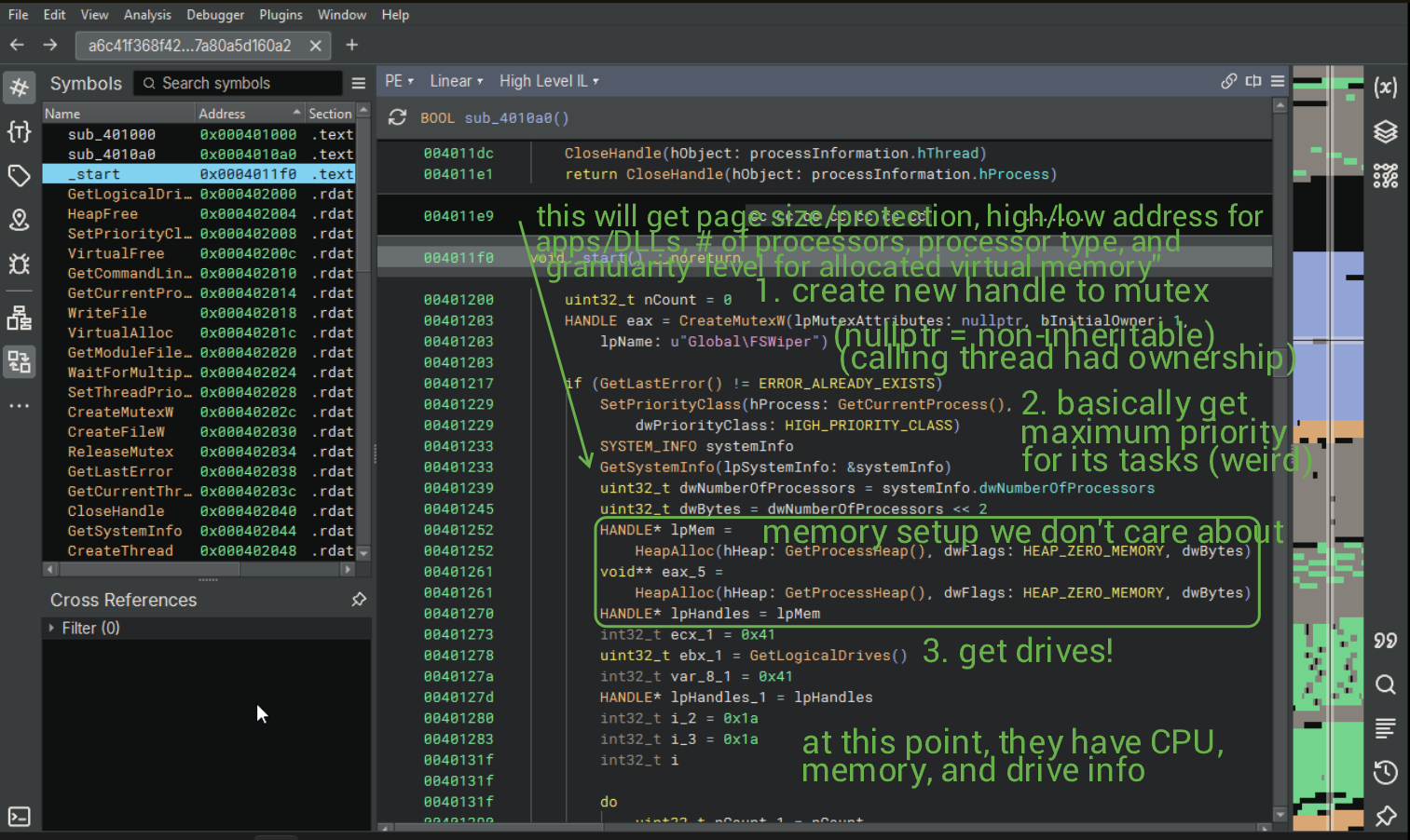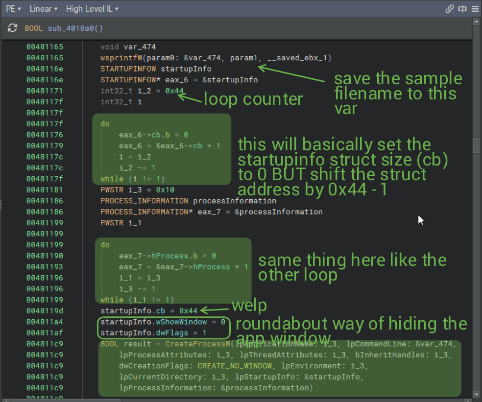3. Decompile the sample (check for dynamic API resolution, obfuscation, and shellcode.) If we encounter any sort of obfuscation, determine how it's done and reverse its functionality to continue analysis.
