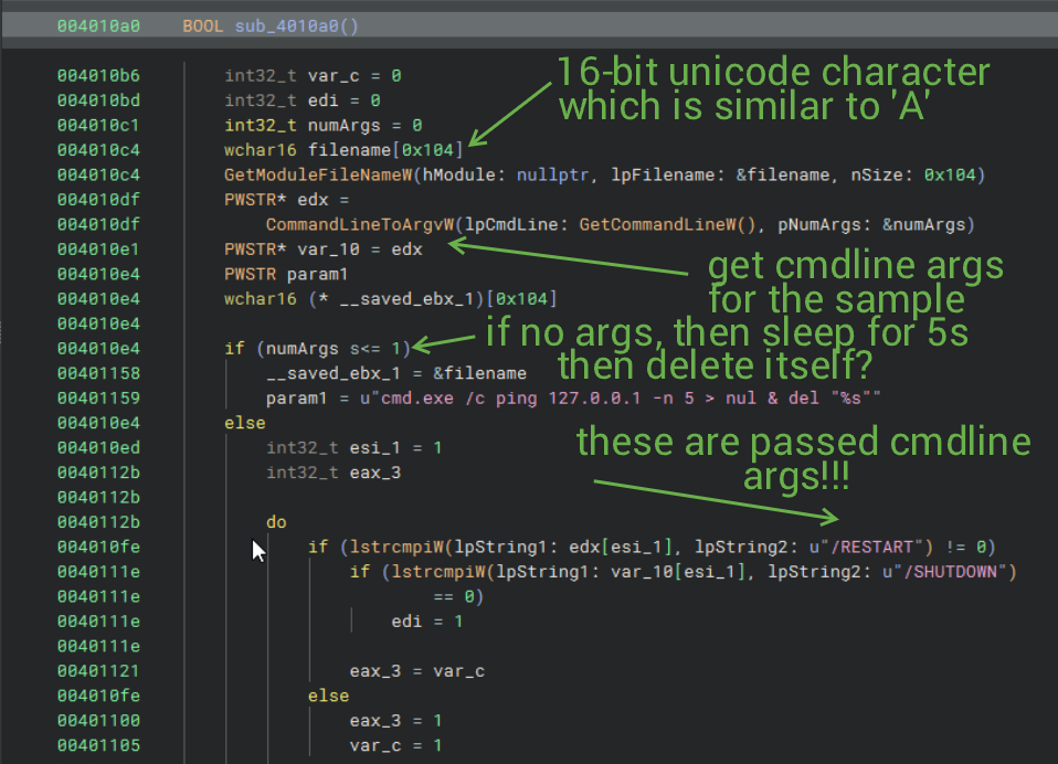 The subroutine continues, and if command line arguments WERE passed, then they would run given the provided argument. In all cases, the sample is QUEUED to self-deletes (param_1 will be used later...).