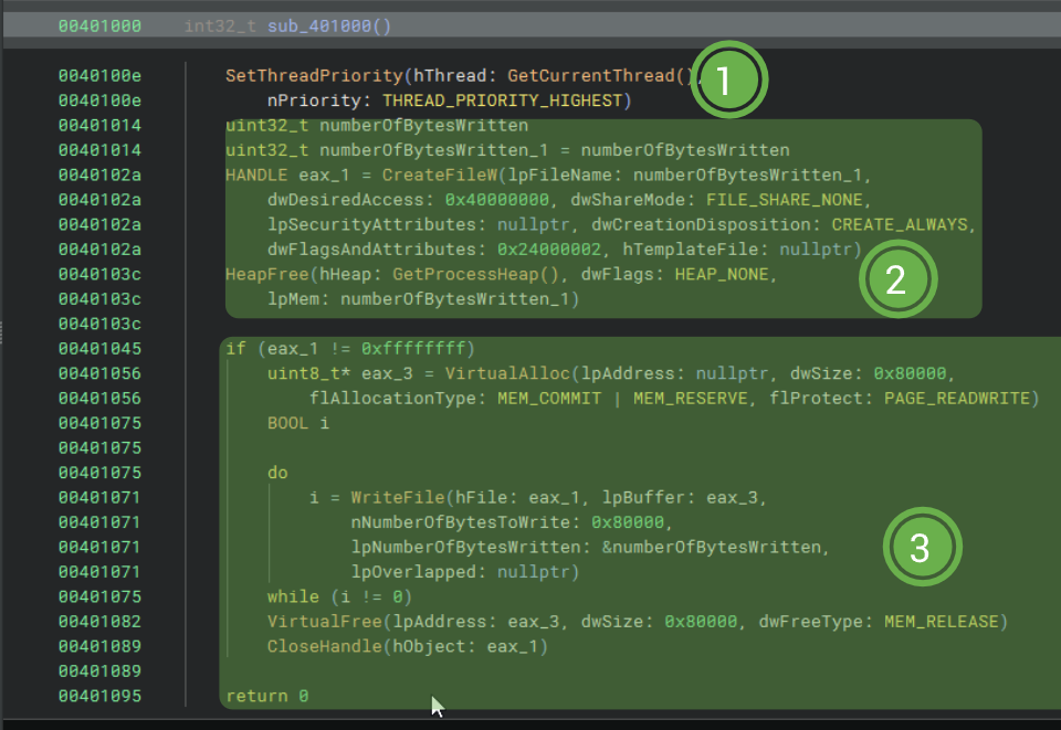 Here comes the fun. We write out to the last created file the data within the last allocated 4MB block. Whatever is in that memory is either garbage or has been previously loaded by the sample, but I believe it to be the former.