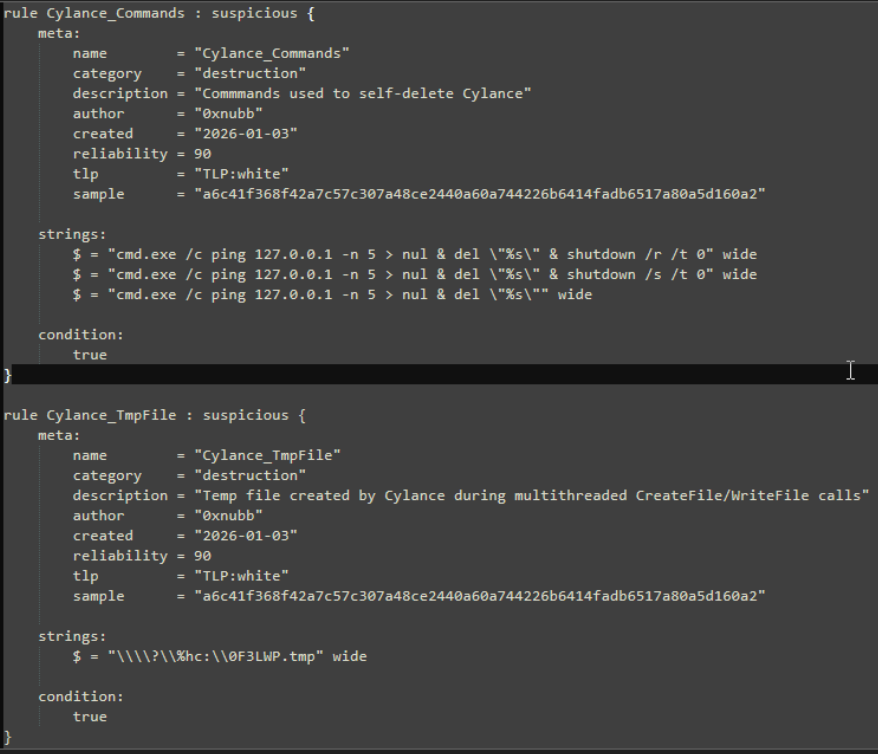 Because I am having too much fun. I decided to create 3 YARA rules encapsulating the 3 big artifacts of this sample, those being the temp filepath/string, the 3 available "completion" commands of the sample, and finally the Mutex name. I made all of these with the help of Malcat's YARA scanner page, which was very nice to interact with. NOTE: these rules are slightly broken with their conditions. See the first edit below.
